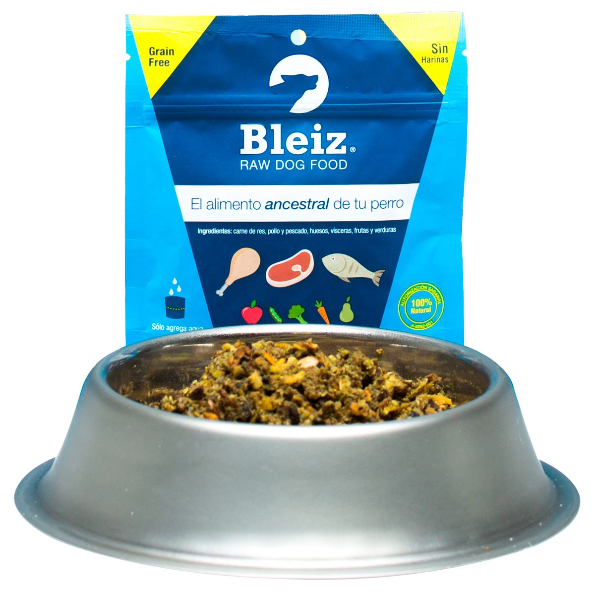 Bleiz alimento natural deshidratado sin granos está elaborado con ingredientes frescos ofreciendo un gran sabor y olor que a tu perro le encantará. Se deshidrata soplando aire a través de los ingredientes a temperaturas controladas para remover la humedad y conservar los nutrientes olores y sabores naturales. Gracias a su práctico empaque es fácil de transportar y guardar. ¡Solamente agrega agua, espera 5 minutos y sirve!