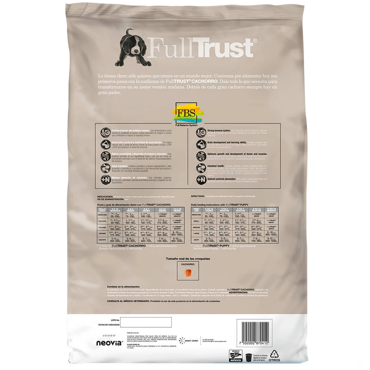 FullTrust Alimento para perro cachorro raza mediana y grande cuenta con ingredientes selectos y la mejor tecnología en nutrición para promover el óptimo desarrollo de articulaciones, huesos y sistema inmune de los cachorros .Gracias a su sistema Full Balance System, FullTrust fortalece el sistema inmune, optimiza el desarrollo de músculos y huesos, apoya al optimo desarrollo cerebral y aprendizaje así como mayor energía y una buena digestión.