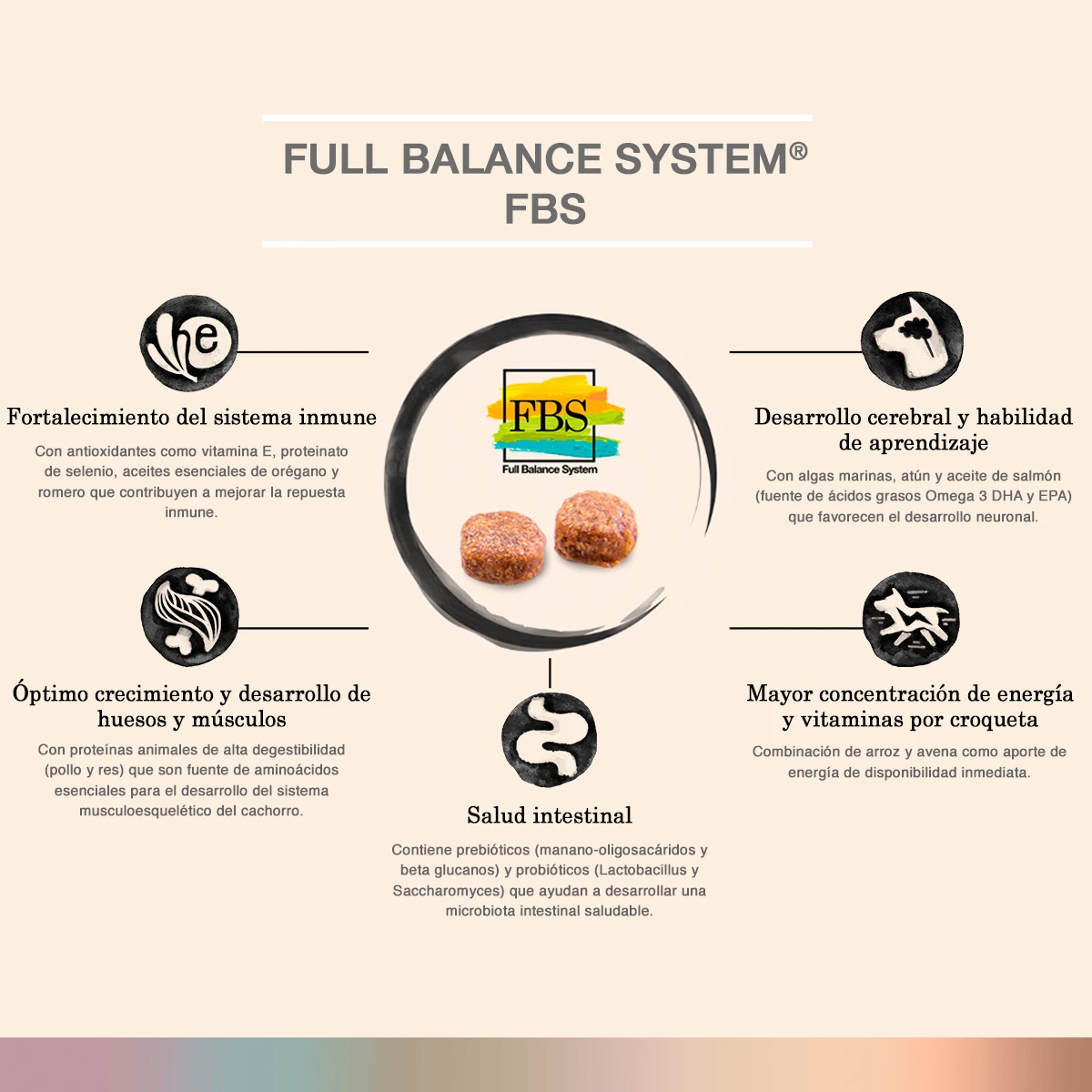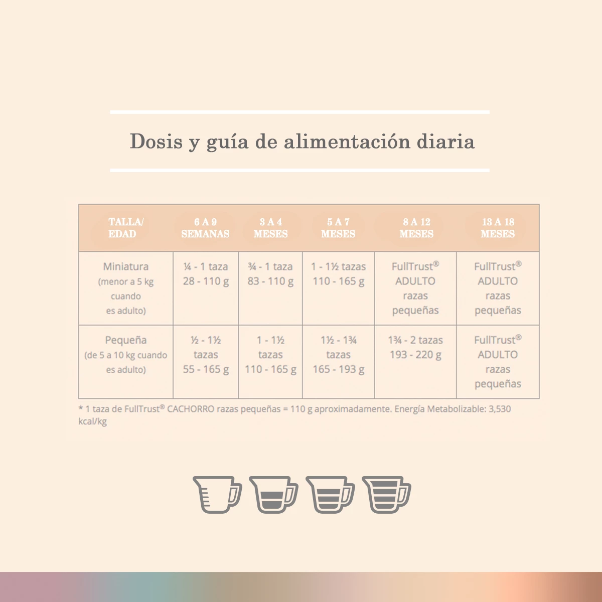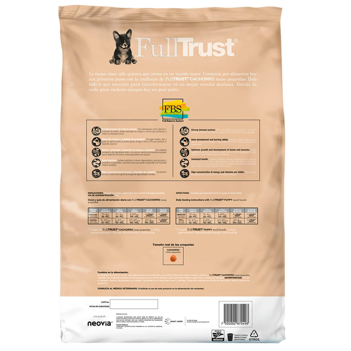 FullTrust Alimento para perro cachorro raza pequeña cuenta con ingredientes selectos y la mejor tecnología en nutrición para satisfacer los requerimientos energéticos e índices de crecimiento de razas pequeñas durante los primeros meses de vida. Gracias a su sistema Full Balance System, FullTrust fortalece el sistema inmune, optimiza el desarrollo de músculos y huesos, apoya al optimo desarrollo cerebral y aprendizaje así como mayor energía y una buena digestión.