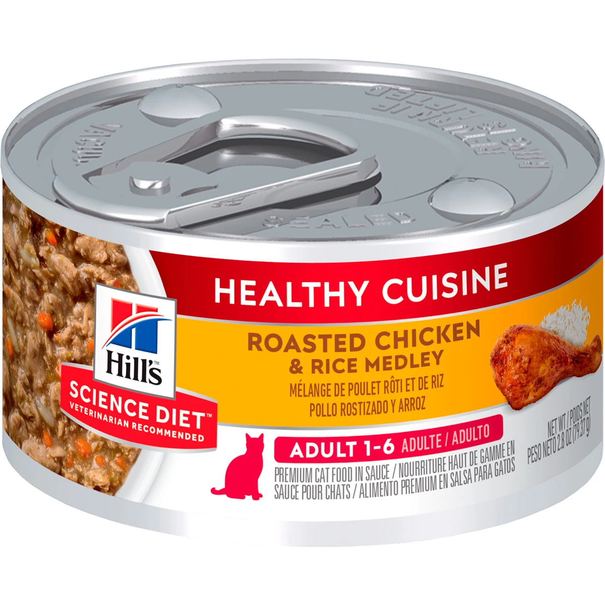 Un gato sano es un gato feliz. Cuando le sirve a su mascota consentida el alimento húmedo para gatos Hill’s Science Diet Healthy Cuisine Receta de pollo y arroz, tiene las dos cosas. Nuestro alimento para gatos está hecho en los EUA con ingredientes importados. Con esta deliciosa mezcla de trocitos de pollo, arroz tierno y sabrosos vegetales, el alimento enlatado para gatos Healthy Cuisine es un alimento que encantará a su gato. Los alimentos enlatados para gatos Science Diet proporcionan el balance perfecto de sabor y nutrición, y no contienen sabores o conservadores artificiales.
