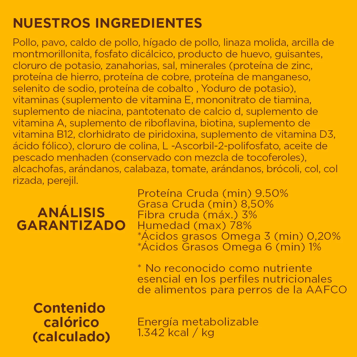 - 95% de pollo, pavo e hígado de pollo; 5% de verduras, frutas y otros ingredientes saludables.