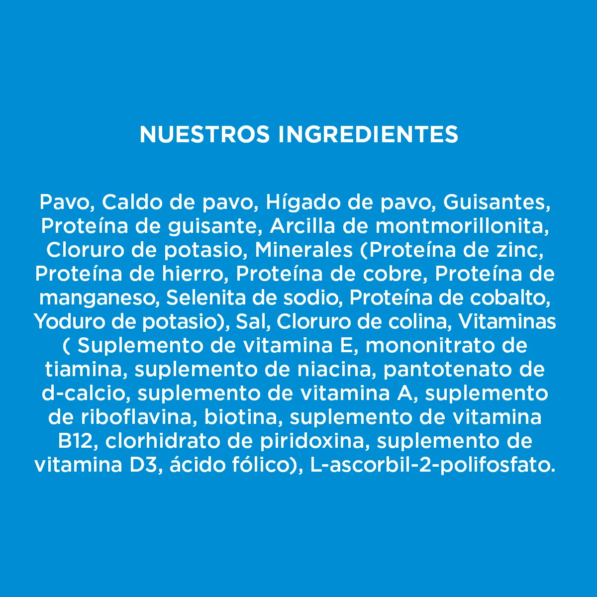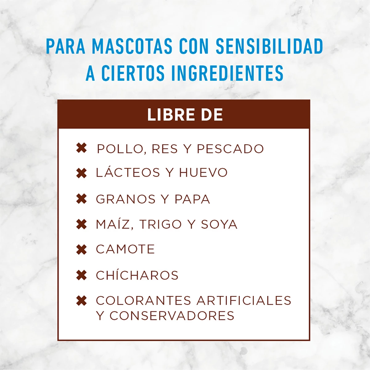 - No contiene pollo, res, huevos o productos lácteos.