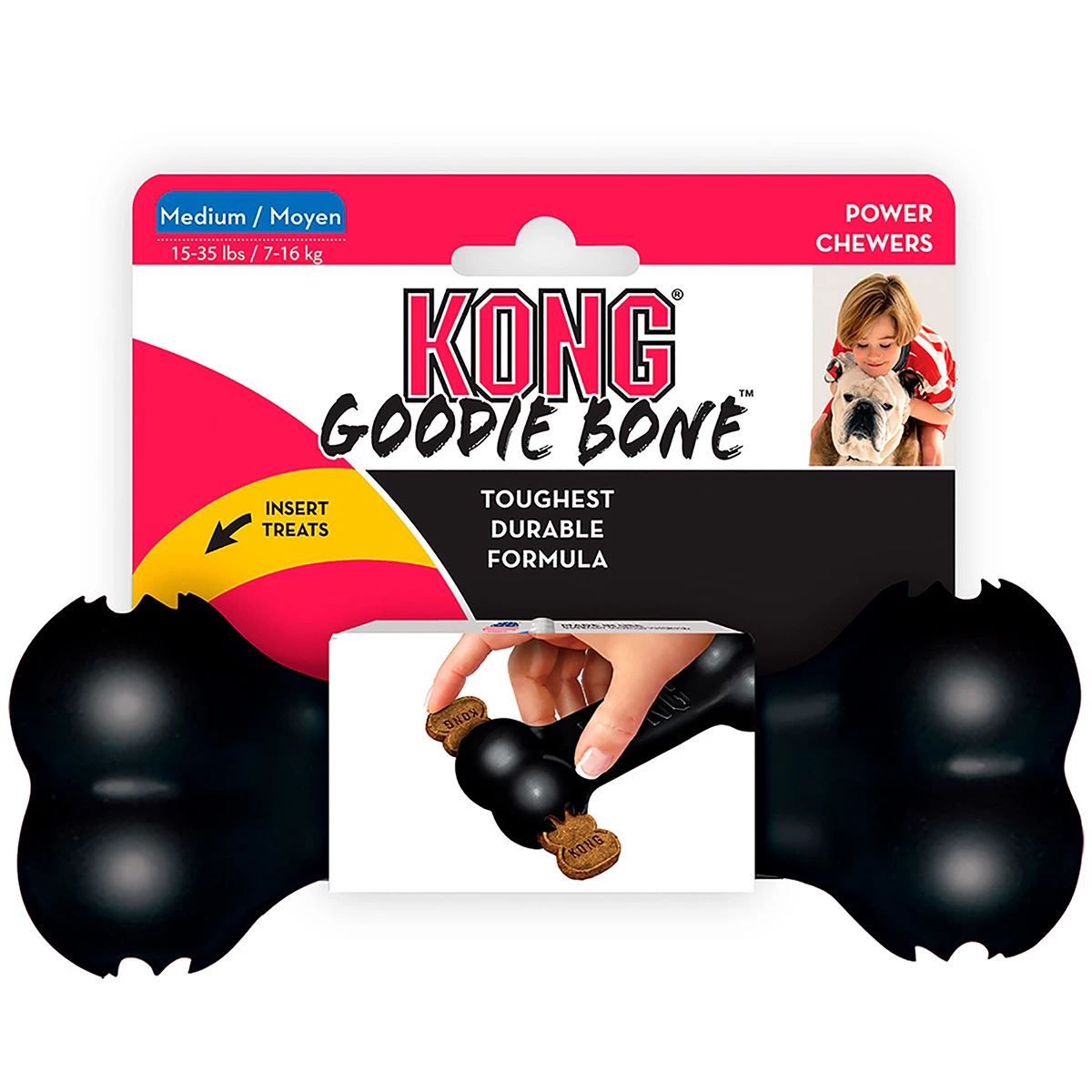 Los KONG Extreme Goodie Bone son ideales para perros con dientes fuertes a los que les encanta masticar juguetes. Fabricados con KONG Extreme una fórmula exclusiva de caucho negro completamente natural y muy resistente estos huesos están diseñados para masticadores experimentados. El KONG Extreme Goodie Bone también cuenta con Goodie Grippers diseño patentado que además de lucir genial convierten a este juguete en todo un desafío mental que deleitará a tu mejor amigo con las sorpresas que lleva en su interior ya que puede rellenarse con las croquetas favoritas de su mascota.