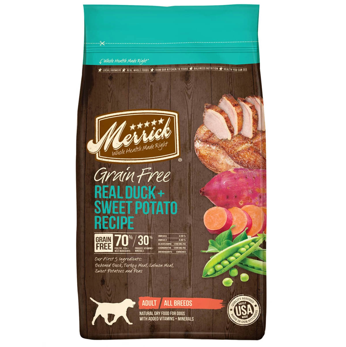 Merrick sin Granos Sabor Pato y Camote, brinda a tu perro una nutrición equilibrada con alimentos integrales. Tiene como primer ingrediente la proteína de pato deshuesado lo que ayudará a tu mascota a mantener y construir un tejido muscular saludable. Su fórmula natural y libre de granos es ideal para perros de todas las razas y tamaños. Contiene Omega 3 y 6 que ayudan a tu perro a tener una piel y pelo saludables ¡El mejor amigo merece la mejor alimentación!