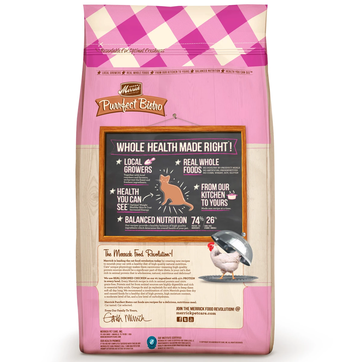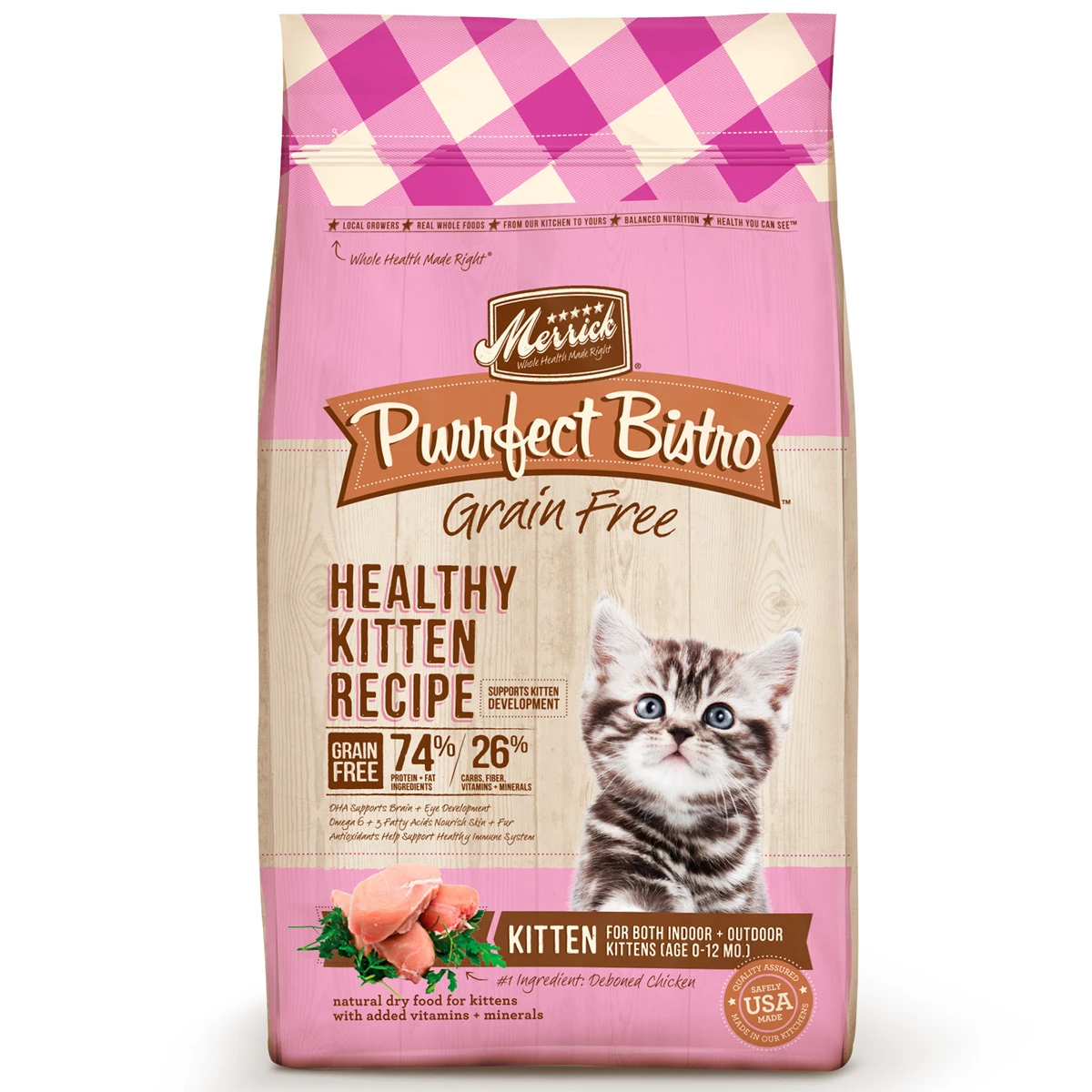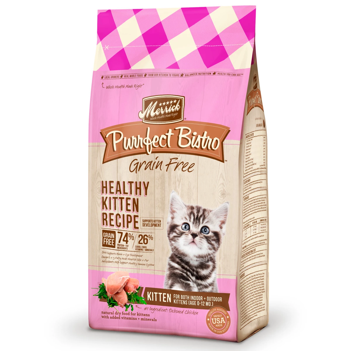 Merrick Purrfect Bistro Alimento Natural para Gatito Receta de Pollo, provee a tu gatito de una dieta libre de granos, con niveles de grasa y bajos niveles de carbohidratos. Su fórmula fortificada con vitaminas, minerales, probióticos y antioxidantes hace de este alimento el ideal para el crecimiento saludable de tu pequeño felino. Creada para satisfacer las necesidades de tu gatito con 75% de proteína y ácidos grasos saludables y 25% de productos frescos, vitaminas y minerales. Enriquecido con DHA que apoya el desarrollo saludable del cerebro. ¡Acompaña el crecimiento de tu gatito con una receta saludable!