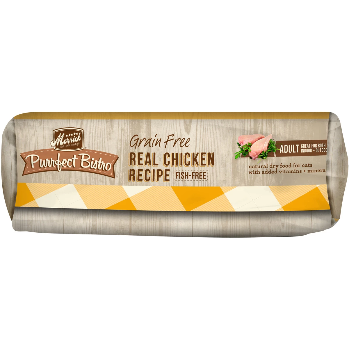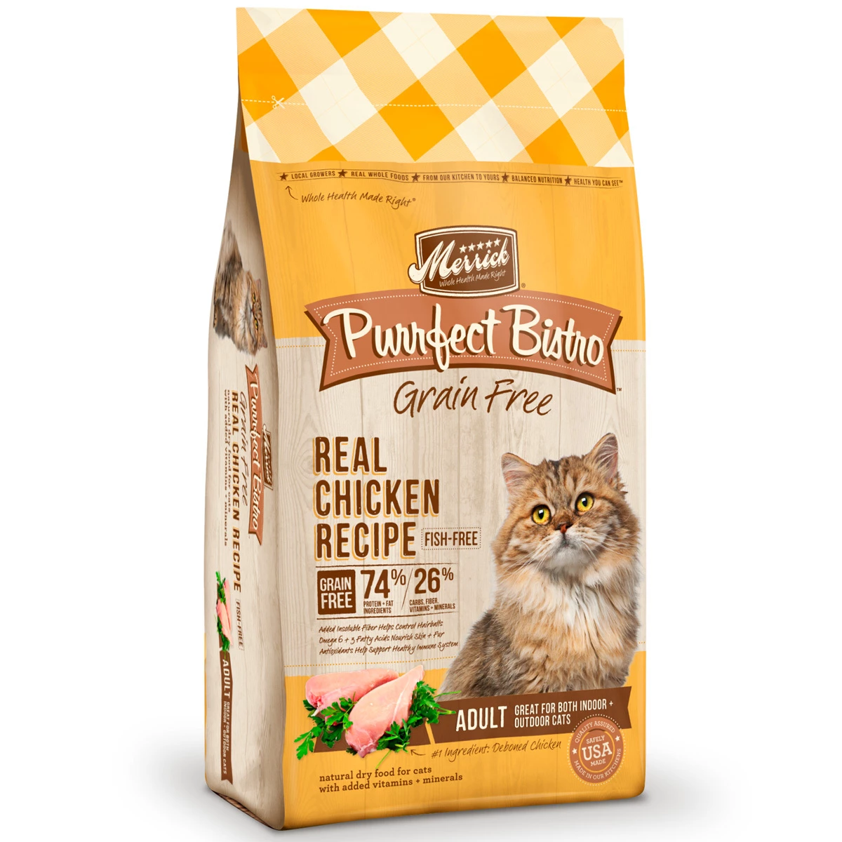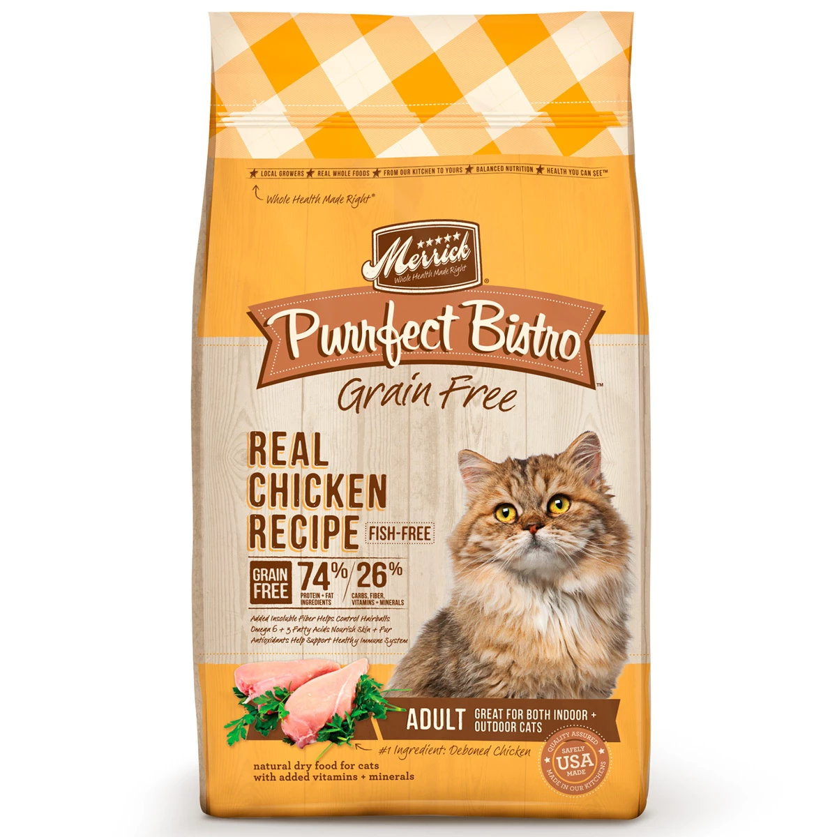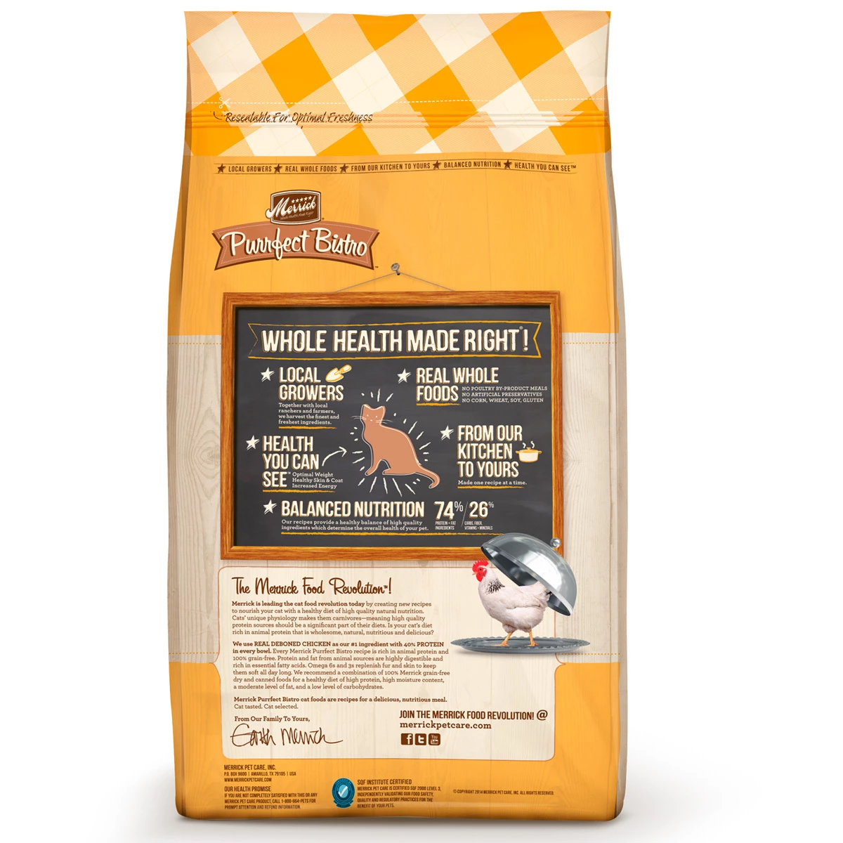 Merrick Purrfect Bistro Alimento Natural para Gato Receta Pollo y Camote, es una dieta libre de granos, alta en proteínas, con niveles moderados de grasa y bajos niveles de carbohidratos. Esta fórmula diseñada para cubrir las necesidades nutricionales de tu gatito, fortificada con vitaminas, minerales y antioxidantes. Creada para satisfacer las necesidades nutricionales de tu gatito con una dieta equilibrada que contiene 70% de proteína y ácidos grasos saludables y 30% de productos frescos, vitaminas y minerales, además, contiene fibra para el control de las bolas de pelo.