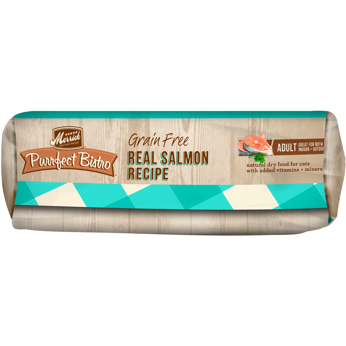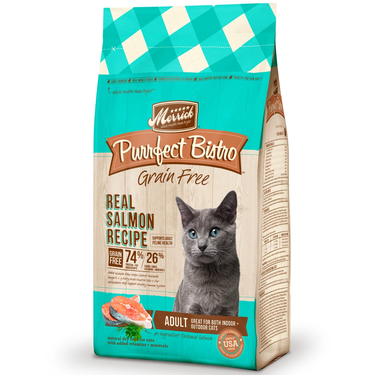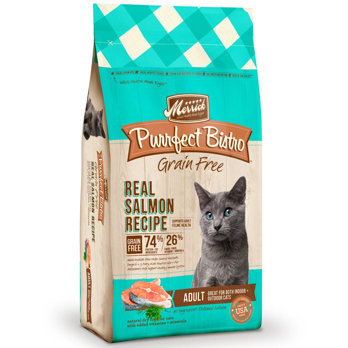 Merrick Purrfect Bistro Alimento Natural para Gato Receta de Salmón, brinda a tu gatito una dieta libre de granos, alta en proteínas, con niveles moderados de grasa y bajos niveles de carbohidratos. Esta fórmula está creada para cubrir las necesidades nutricionales de tu mascota gracias a que está fortificada con vitaminas, minerales y antioxidantes. Diseñada con una dieta equilibrada que contiene 70% de proteína y ácidos grasos saludables y 30% de productos frescos, vitaminas y minerales, además, provee a tu felino de salud que puedes observar, ya que contiene ácidos grasos esenciales como Omega- 6 y 3 que ayudarán a que tu gato tenga una piel pelo saludable y suave.