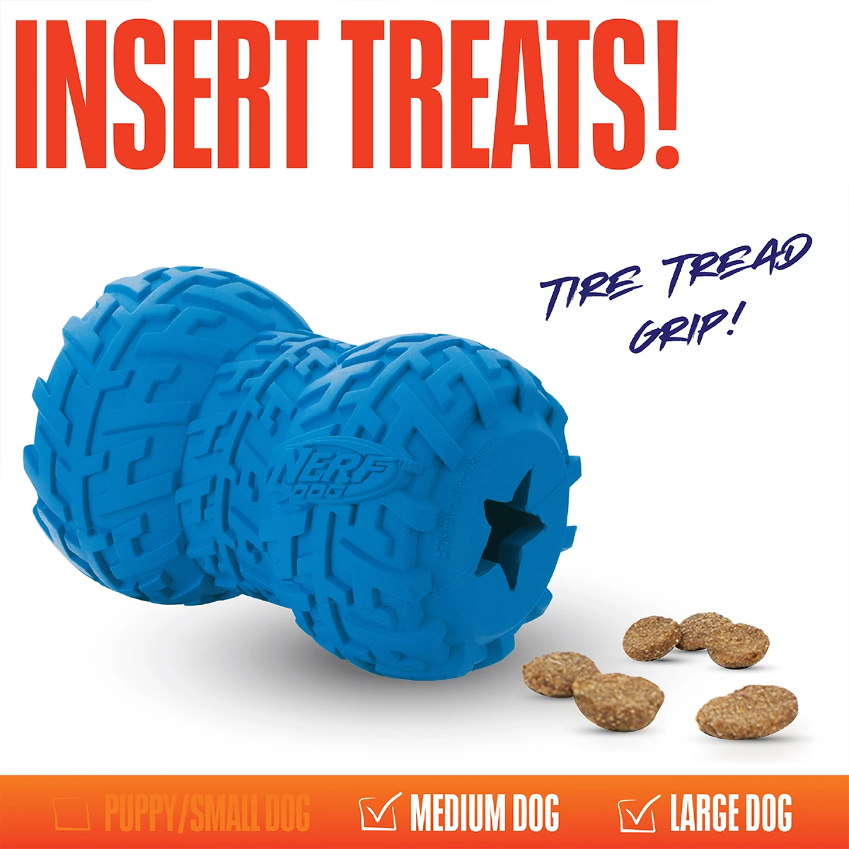 Simplemente ll茅nalo con las golosinas o comida favorita de tu perro y observa c贸mo 茅l afronta el desaf铆o de sacarlos. El alimentador grande Nerf Dog es una pieza moldeada de goma duradera, lo que lo hace extra fuerte, por lo que resistir谩 una masticaci贸n prolongada. 隆Las crestas texturizadas tambi茅n lo hacen ideal para lanzar y buscar!