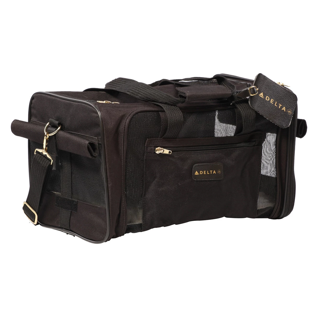 La transportadora Delta Deluxe es ideal para llevar en el automóvil o en el avión durante los viajes, cuenta con una puerta de entrada y salida en la parte superior y en el lateral para tener acceso fácilmente. Una bolsa para guardar objetos útiles en el camino, ventilación para que tu mascota respire libremente gracias a su diseño con malla transpirable, zippers de seguridad, un asa de mano acolchada y ajustable para tu comodidad y un cinturón ajustable para llevar la transportadora en tu hombro, incluye un tapete acolchado extraíble para mayor confort. ¡Es muy suave, y calientito! La transportadora se ajusta excelente debajo de la mayoría de los asientos de los aviones, incluye una tarjeta de identificación para la mascota y en ambos lados de la transportadora, una cortina para tapar la malla transpirable cuando el perrito está estresado. ¡Usa el cinturón para asegurar y dar mayor soporte! Consulta los requisitos de tu aerolínea para escoger la indicada para ti.
