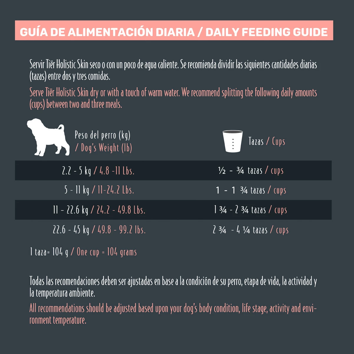Tïer Holistic Skin Alimento Natural para perro ayudará a tu mascota a mejorar los padecimientos de piel y pelo, beneficiándole en la salud de su organismo. Elaborado con pollo, pescado, huevo, frutas y vegetales, ácidos grasos omega balanceados para ayudar a piel y pelo, libre de maíz, trigo o soya y enriquecido con vitamina E y C sin duda este alimento es la opción que estabas buscando para consentir a tu mejor amigo.