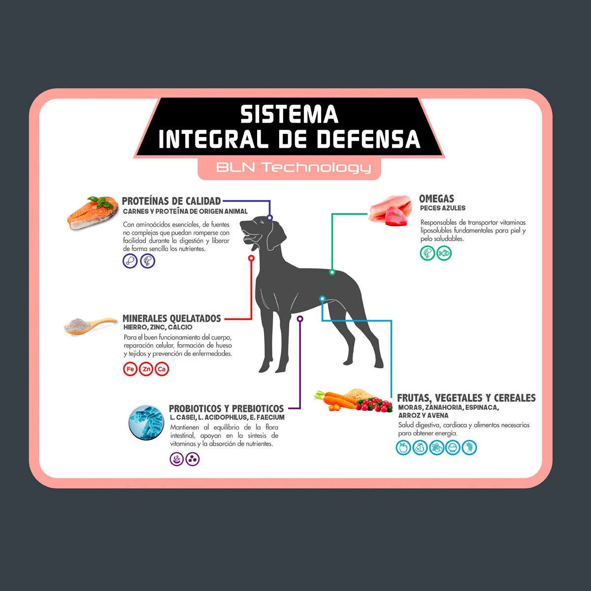 - Frutas, Vegetales y Cereales especialmente seleccionados pensando en la salud digestiva, cardiaca y niveles de energía que requiere tu cachorro.