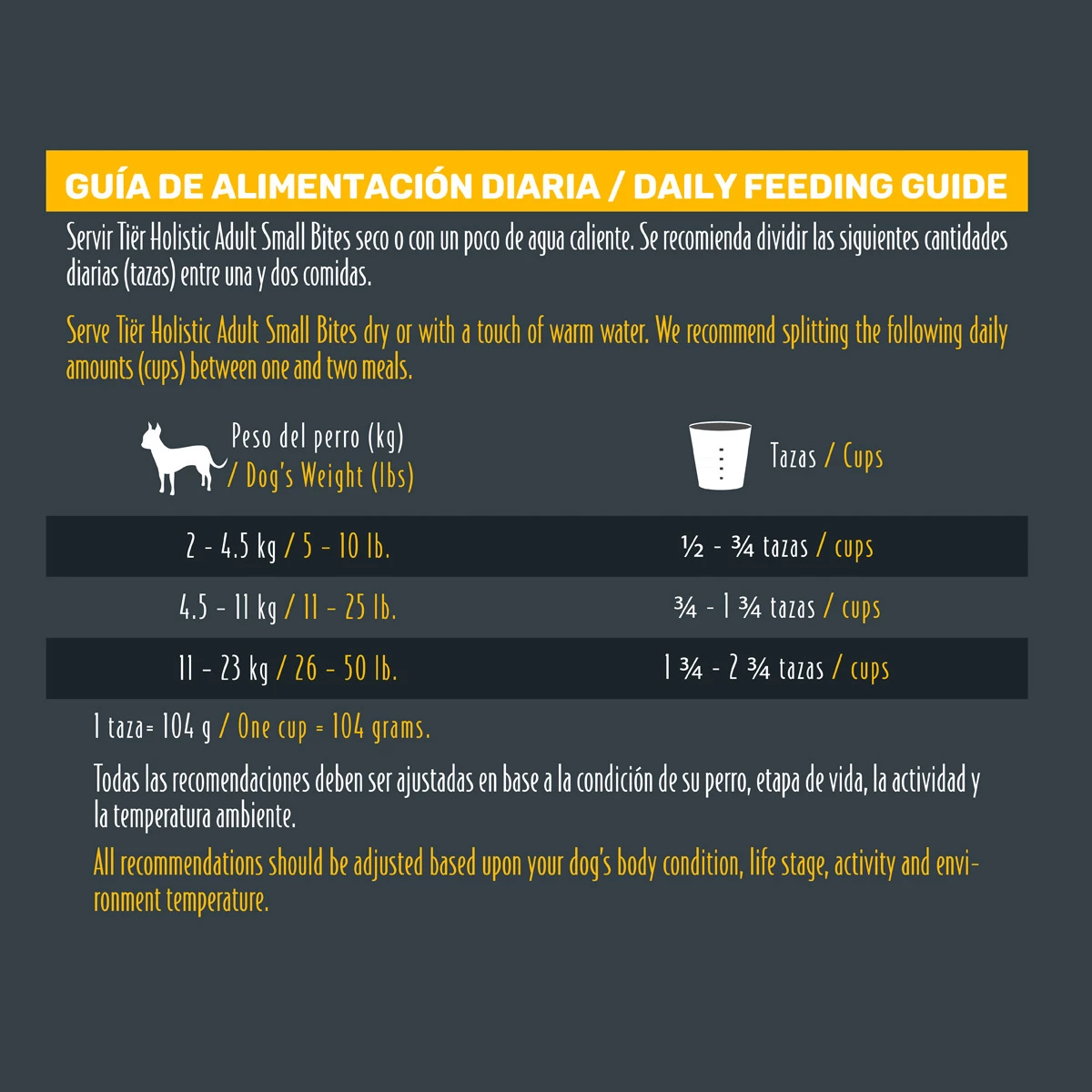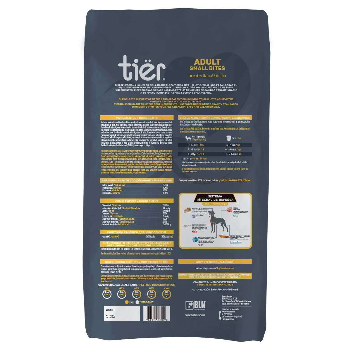 Tïer Holistic Small Bites Alimento Natural para perro esta diseñado especialmente para las razas pequeñas ya que otorga un adecuado nivel de calorías y antioxidantes para su nivel de metabolismo acelerado. Elaborado con pollo, pescado, huevo, frutas y vegetales, así como ácidos grasos esenciales nutre a tu mascota para una vida larga y saludable. Libre de maíz, trigo o soya y enriquecido con vitamina E y C sin duda este alimento es la opción que estabas buscando para consentir a tu mejor amigo.
