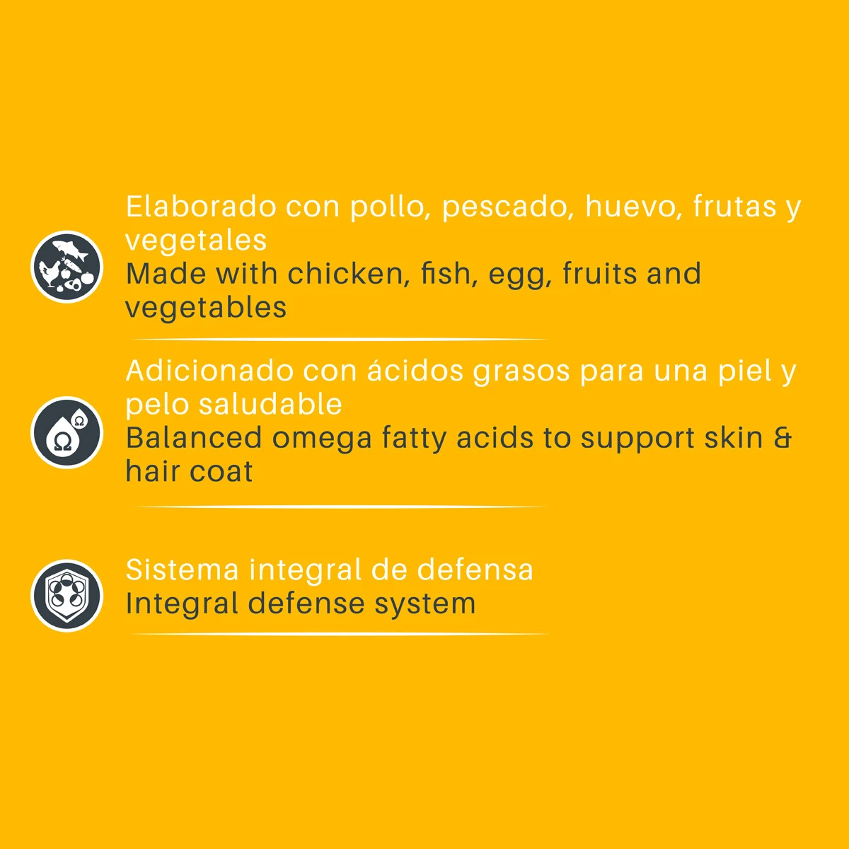 - Frutas, Vegetales y Cereales especialmente seleccionados pensando en la salud digestiva, cardiaca y niveles de energía que requiere tu cachorro.