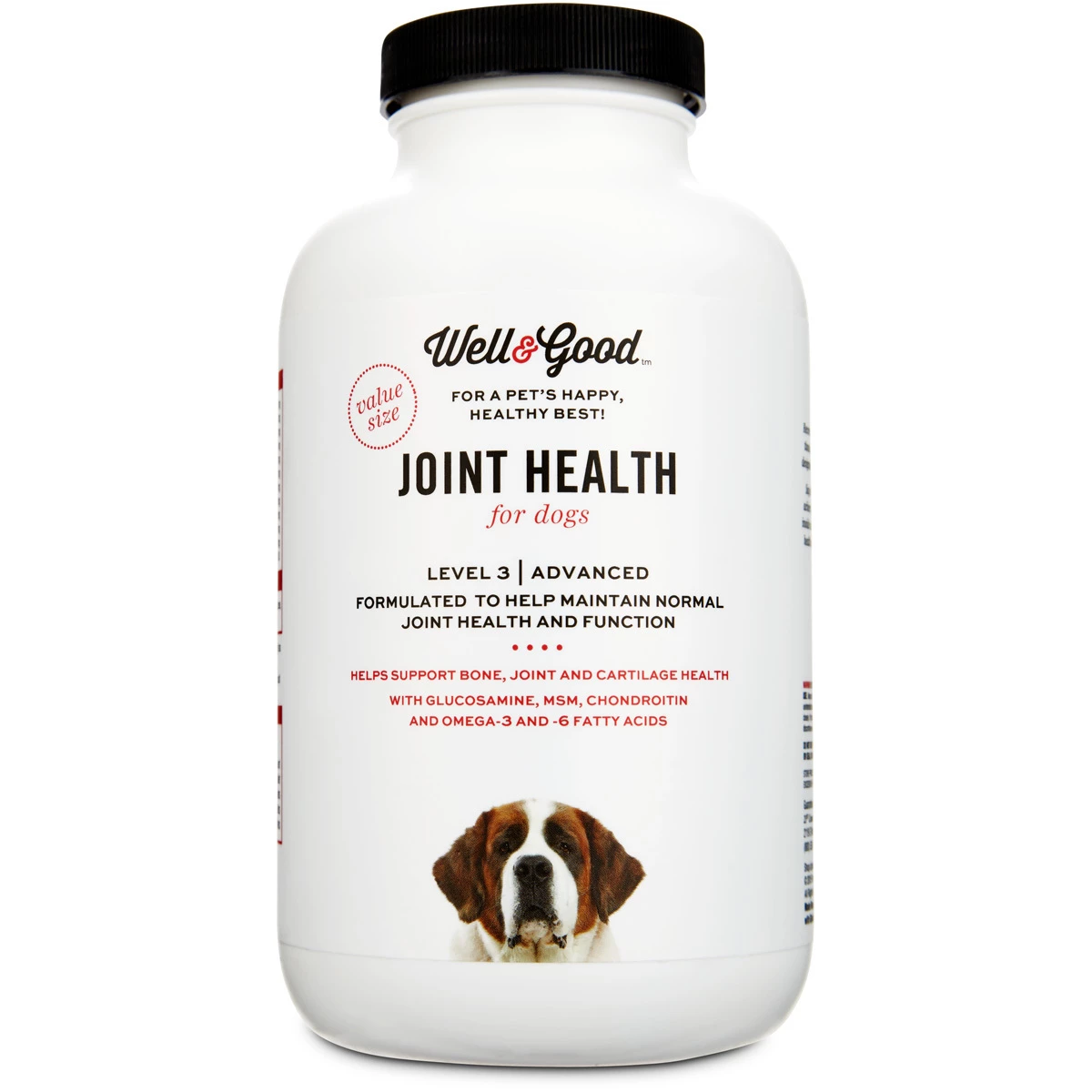 Las tabletas para la salud articular de nivel 3 para perros de Well & Good ofrecen una fórmula avanzada que respalda las funciones de las articulaciones y los tejidos conectivos para aliviar la rigidez de las articulaciones debido al ejercicio diario. Son ideales para perros adultos activos de razas medianas a grandes y también son irresistibles gracias a su sabor a pollo.