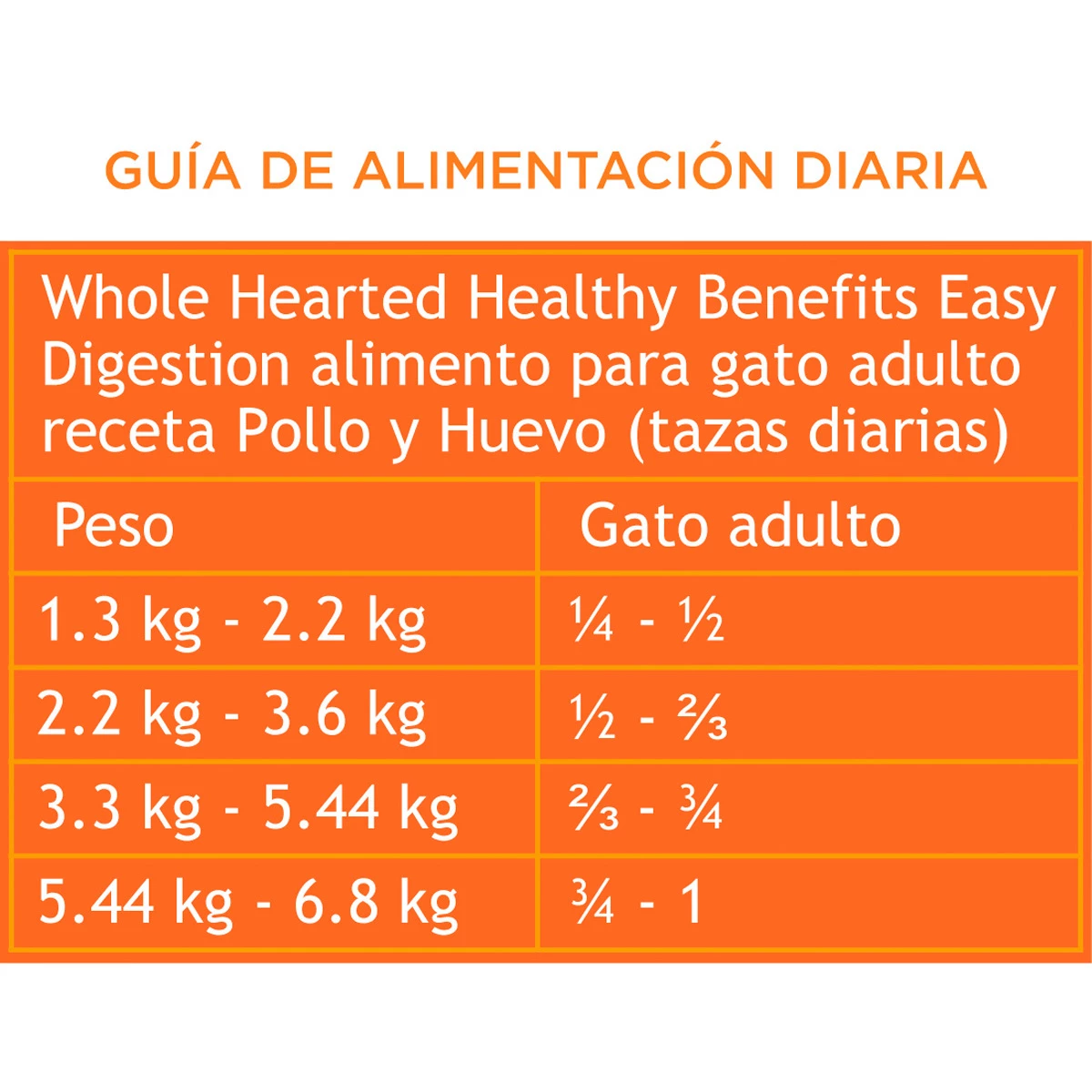 Wholehearted Fácil Digestión Alimento Natural para Gato Receta Pollo y Huevo, es la fórmula ideal para el organismo de tu mascota gracias a sus ingredientes digeribles y sus múltiples fuentes de fibra. También contiene cultivos vivos activos que ayudan en el proceso digestivo de tu gato. Proporciona una comida con proteína de alta calidad completa y equilibrada con un sabor que a tu felino le encantará.