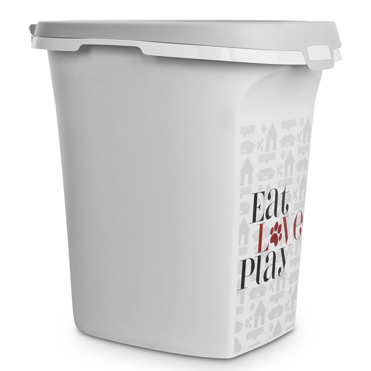 - El contenedor tiene un diseño blanco con el diseño Eat Love Play en el frente.